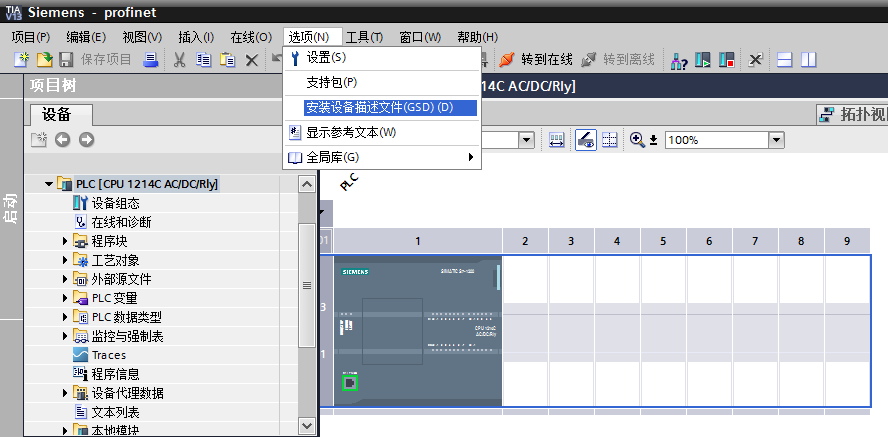 將GSDML文件拷貝入計(jì)算機(jī)硬盤。啟動(dòng)“TIA Portal V13 ”軟件,打開任意工程,在軟件菜單欄點(diǎn)擊“選項(xiàng)”按鈕,在彈出的子菜單中點(diǎn)擊“安裝設(shè)備描述文件”。
